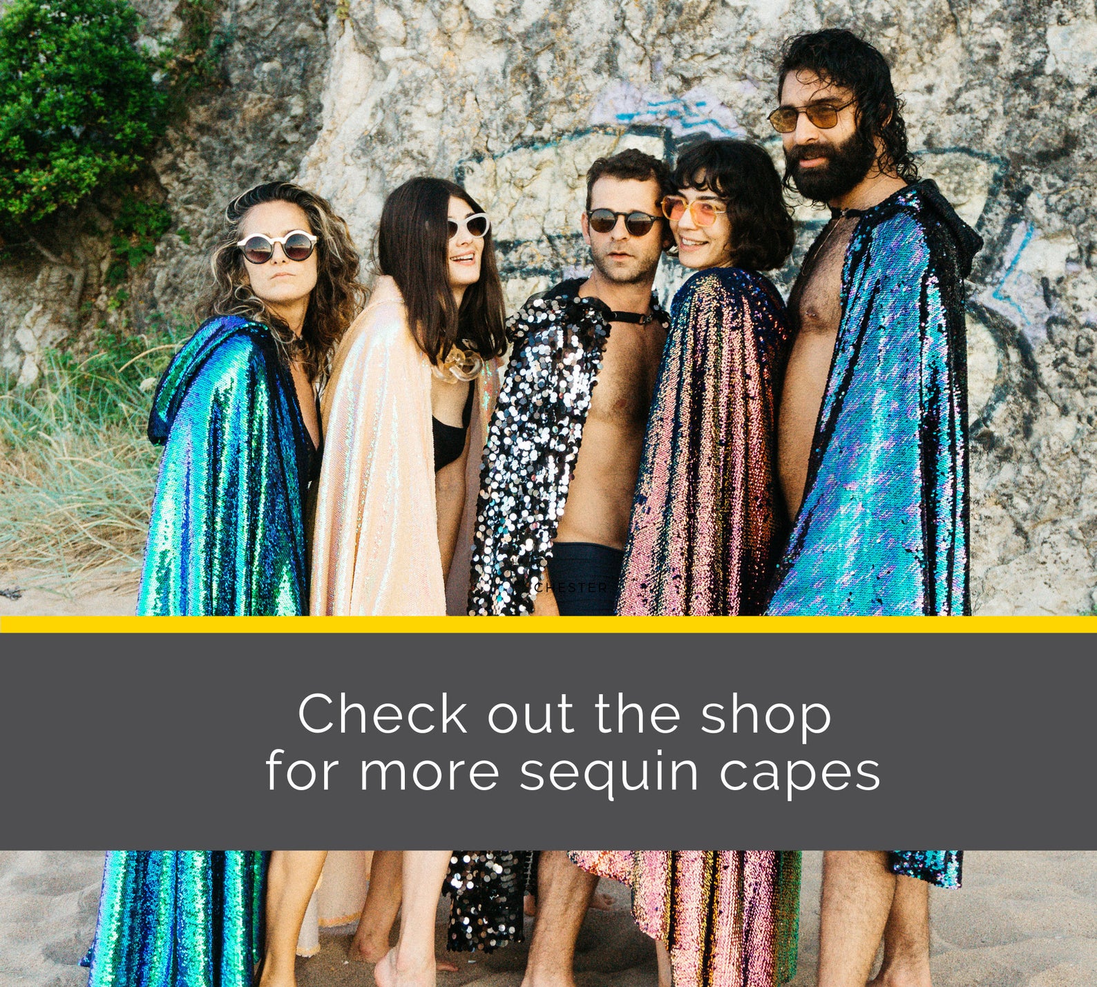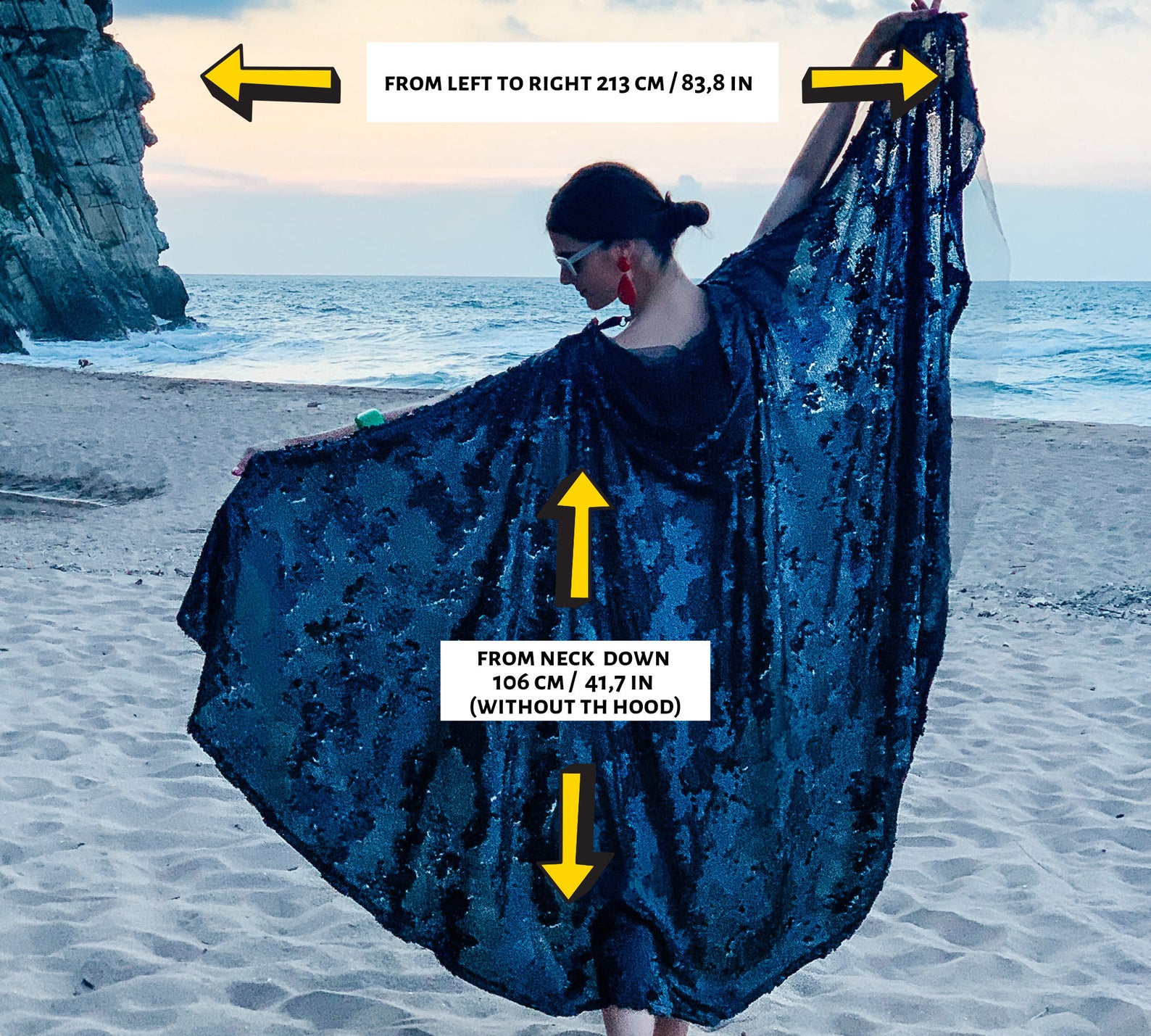 Dieses sexy Pailletten-Cape mit Kapuze ist für alle Schwarz-Liebhaber. Lasse Dich von seinem Funkeln blenden und deine Stimmung wird automatisch steigen!