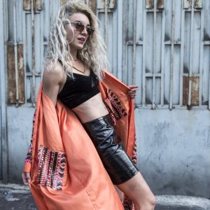 Orange, blau, gelb, grün und rosafarbene Pailletten, auf einem hochwertigen Tüll, bilden ein einzigartiges ethnisches geometrisches Muster. Das 100%ige Bio-Satin-Futter in orange fühlt sich super weich auf der Haut an und macht diese Rave-Kleidung sehr bequem zu tragen.