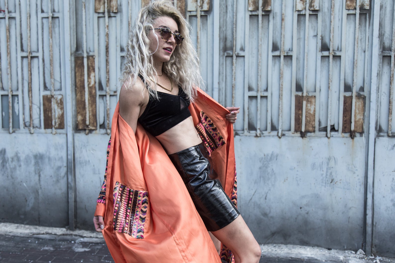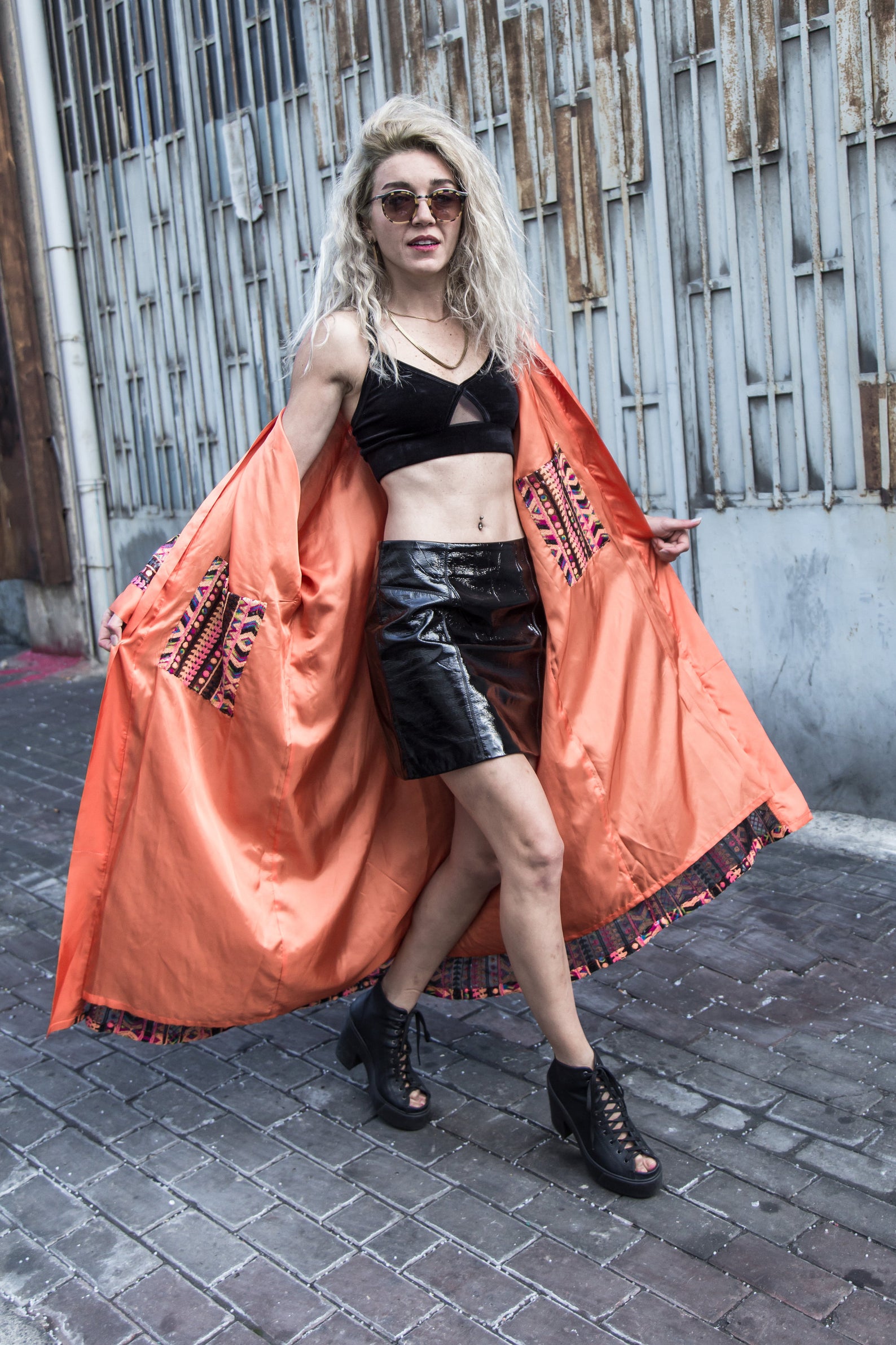 Orange, blau, gelb, grün und rosafarbene Pailletten, auf einem hochwertigen Tüll, bilden ein einzigartiges ethnisches geometrisches Muster. Das 100%ige Bio-Satin-Futter in orange fühlt sich super weich auf der Haut an und macht diese Rave-Kleidung sehr bequem zu tragen.