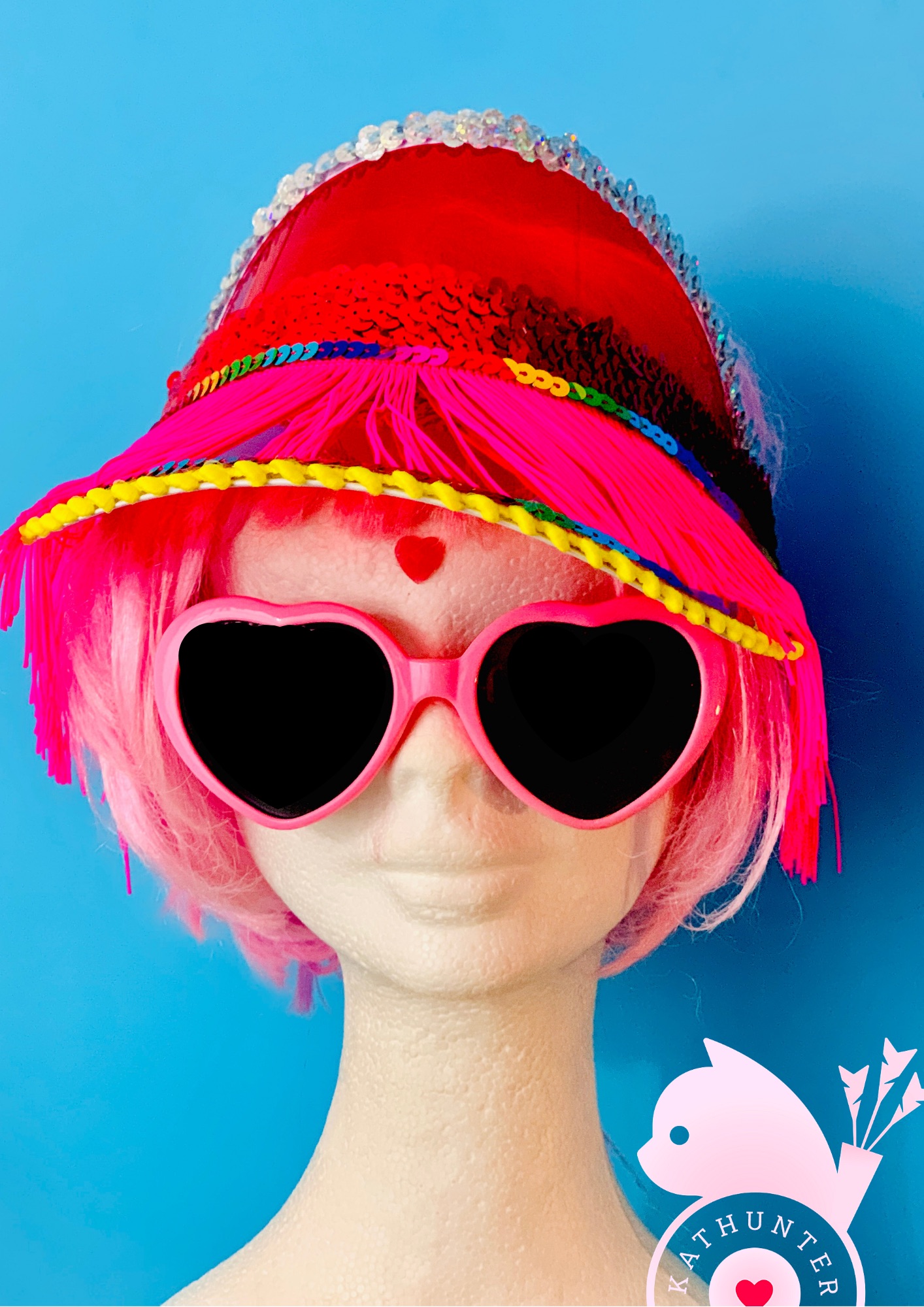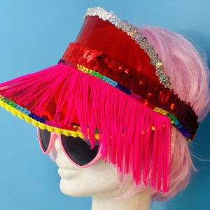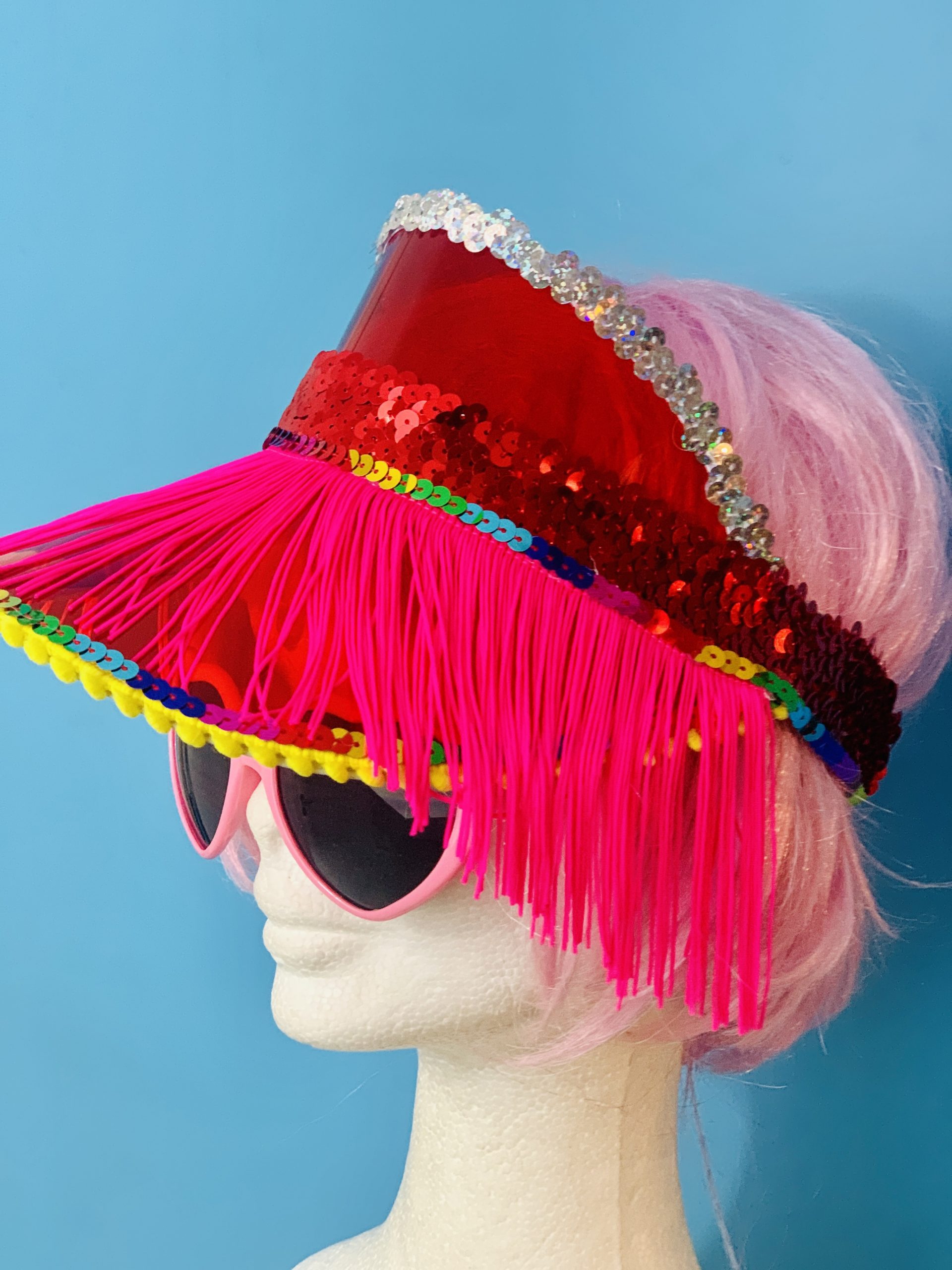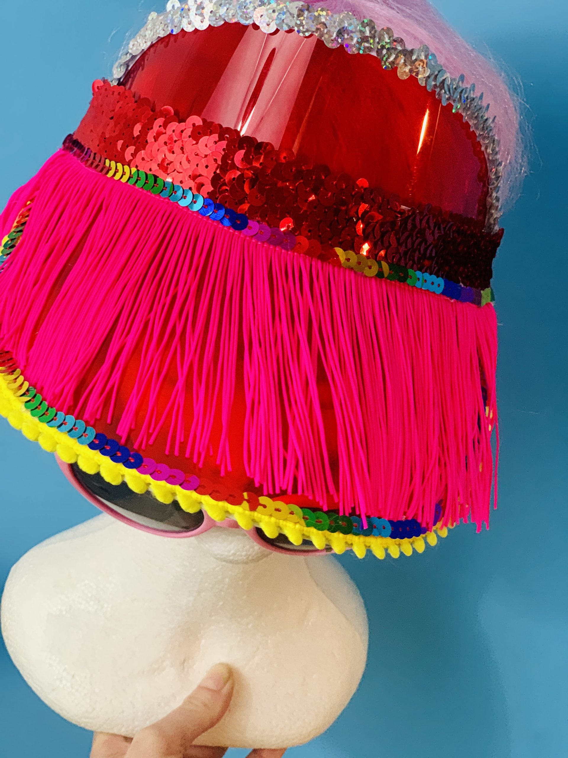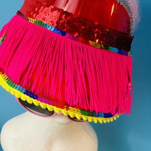 The newest baby of our collection comes in fire red with neon pink, long and high quality fringes. It sparkles with holo-silver, red and rainbow colored sequins and has a yellow braided finish. Wear it regular or upside down, it will upgrade your outfit no matter the occasion!