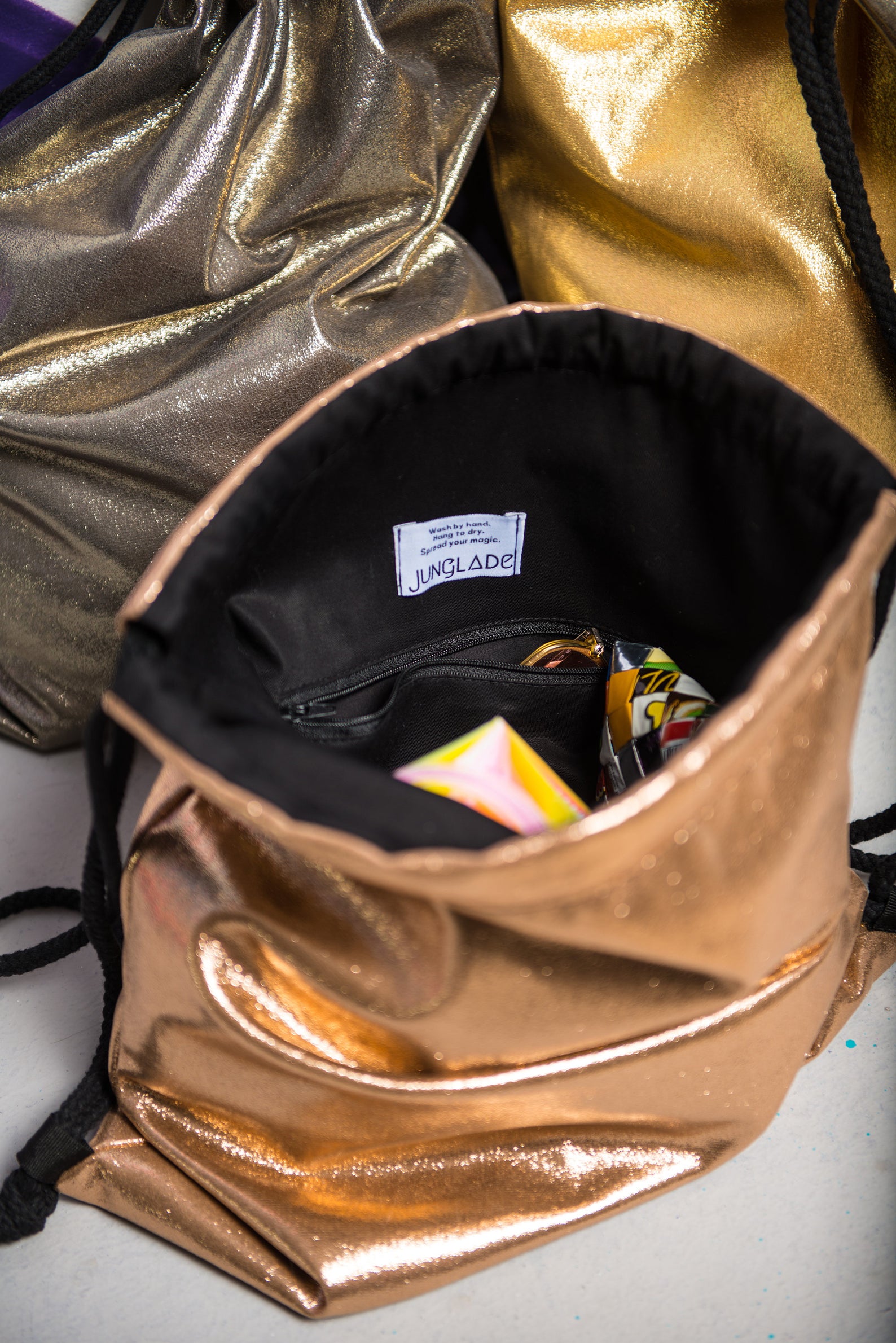 Hochwertiger weicher Stoff, stabiles und zugleich weiches Innenmaterial, sowie die glänzende metallic-Roségoldfarbe, die das Licht reflektiert, machen diese Tasche zu einem echten Hingucker. Eine große innenliegende Reißverschlusstasche, beispielsweise für das Verstauen Deinens Telefons, machen ihn unglaublich praktisch für jede Veranstaltung – egal ob Rave, Festival, Party oder auch im Alltag für alle, die gerne glänzen.