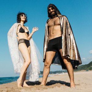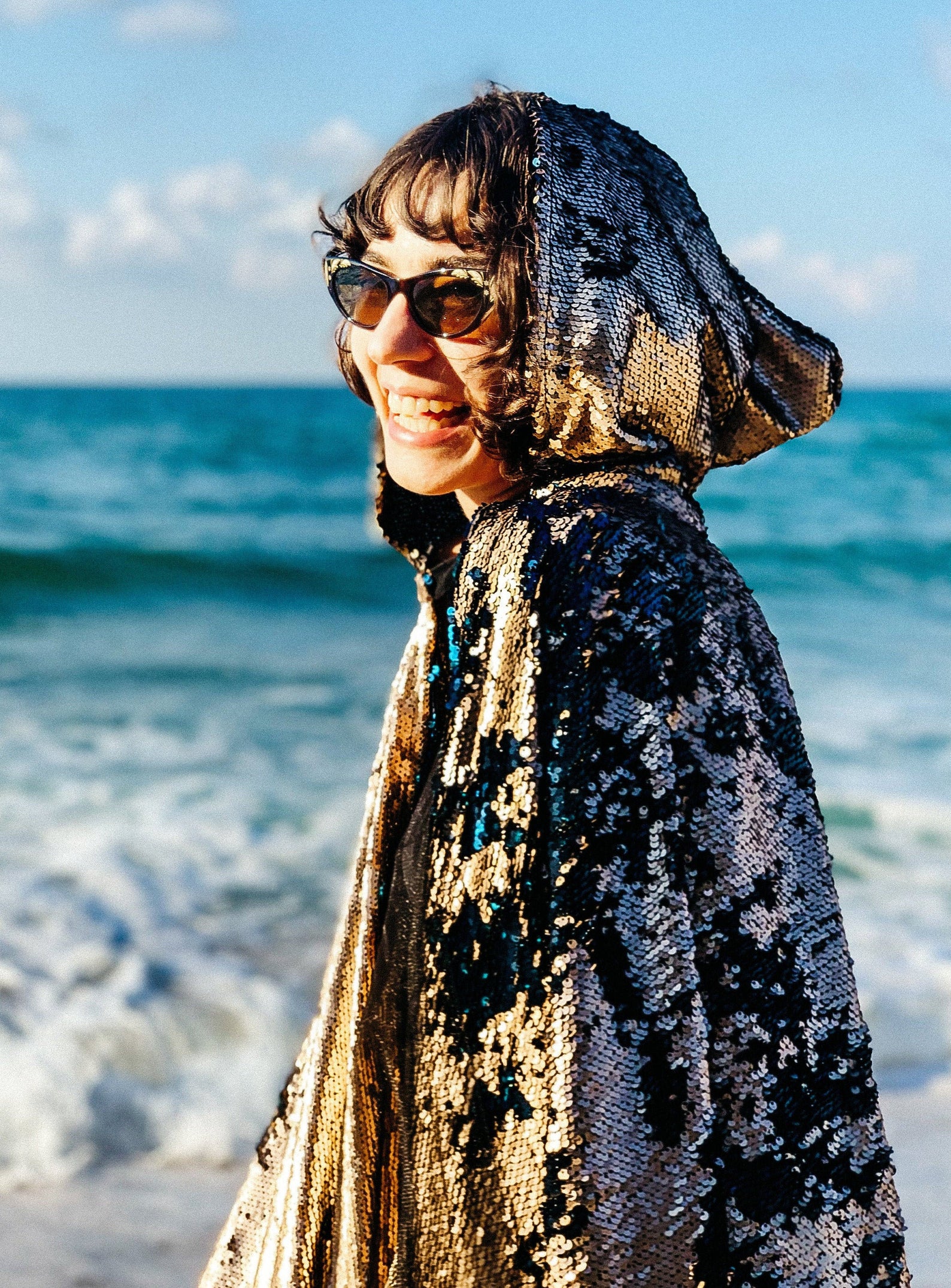 Wunderschöne Wende-Pailletten (Bronze / blau) machen dieses Cape zu einem wirklich originellen, einzigartigen Festival Kimono. Als Burning Man Mantel oder Cosplay Kostüm, ist unser Siamese Cat Cape definitiv ein Stück Rave-Outfit, das Du nicht verpassen möchtest. Streiche mit der Hand über das Cape, um die blaue Seite der Pailletten zu enthüllen.