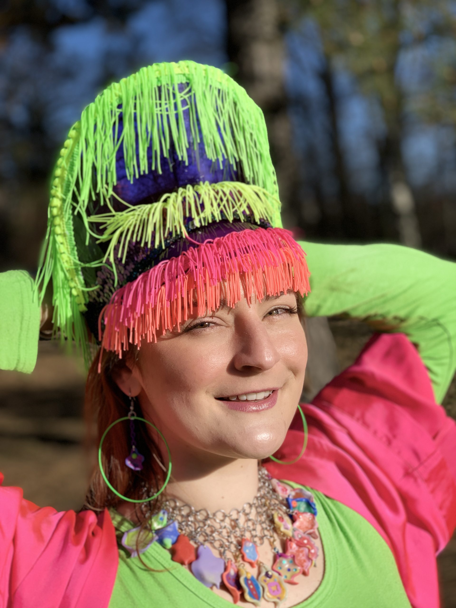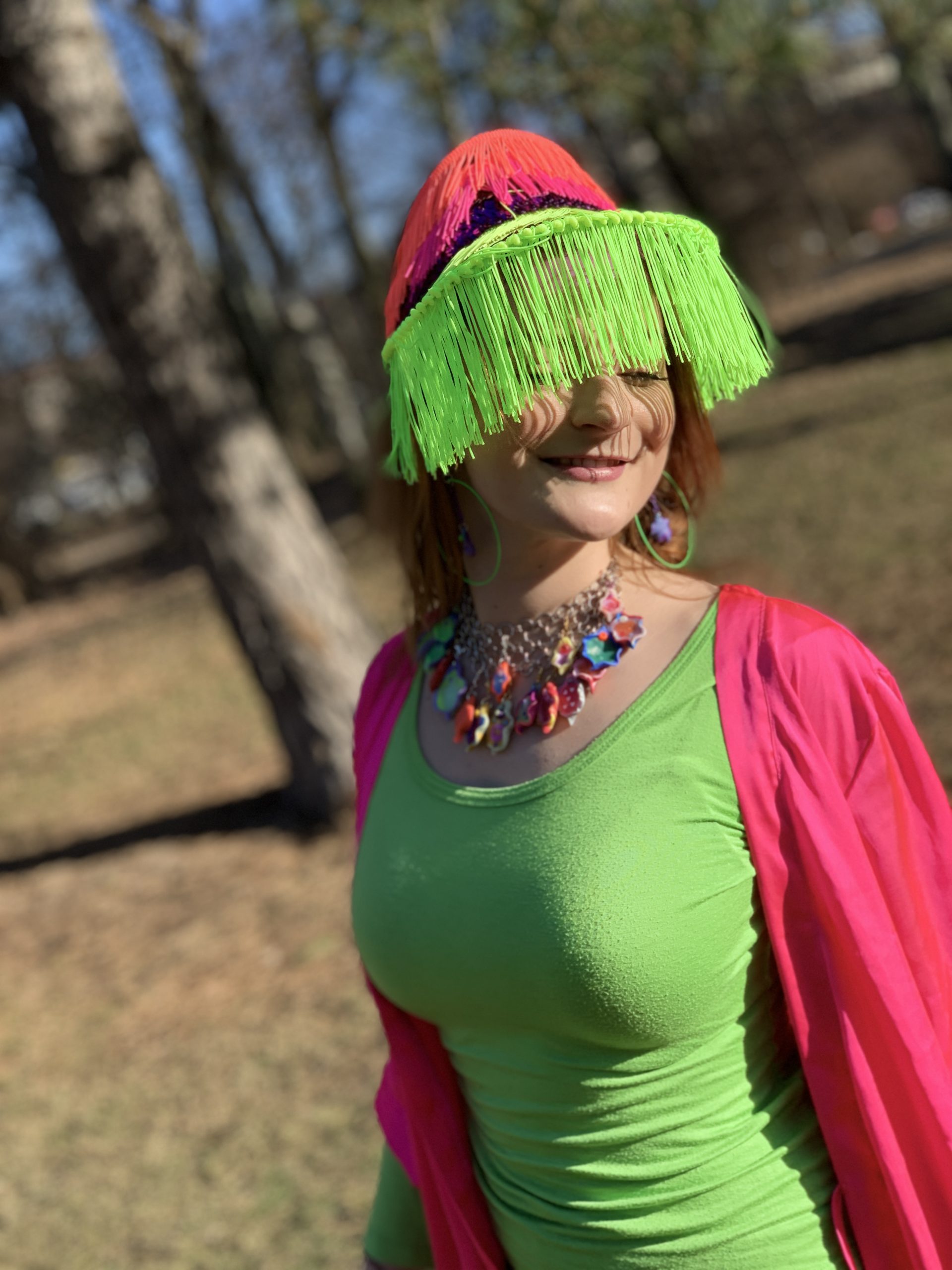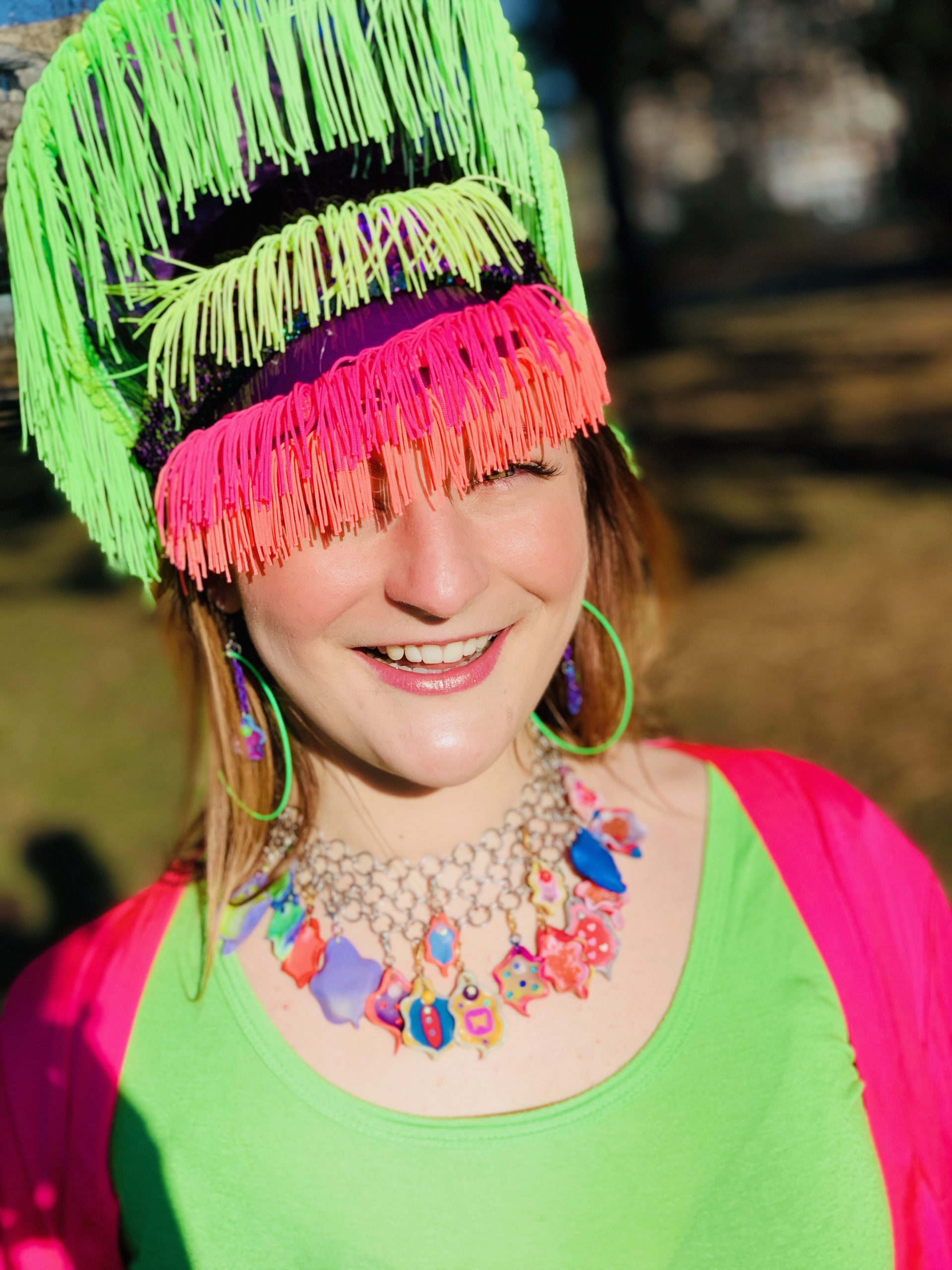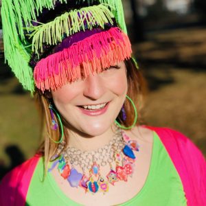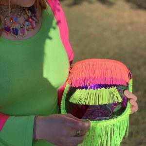 This neon coloured Set consists of a beautiful pair of handmade vulva earrings by our new brand Clitlov3 and a matching purple Cap Hunter Tassel Neon Visor. It’s so much fun – and with or without darklight, you can never ever get lost again, promised 🙂